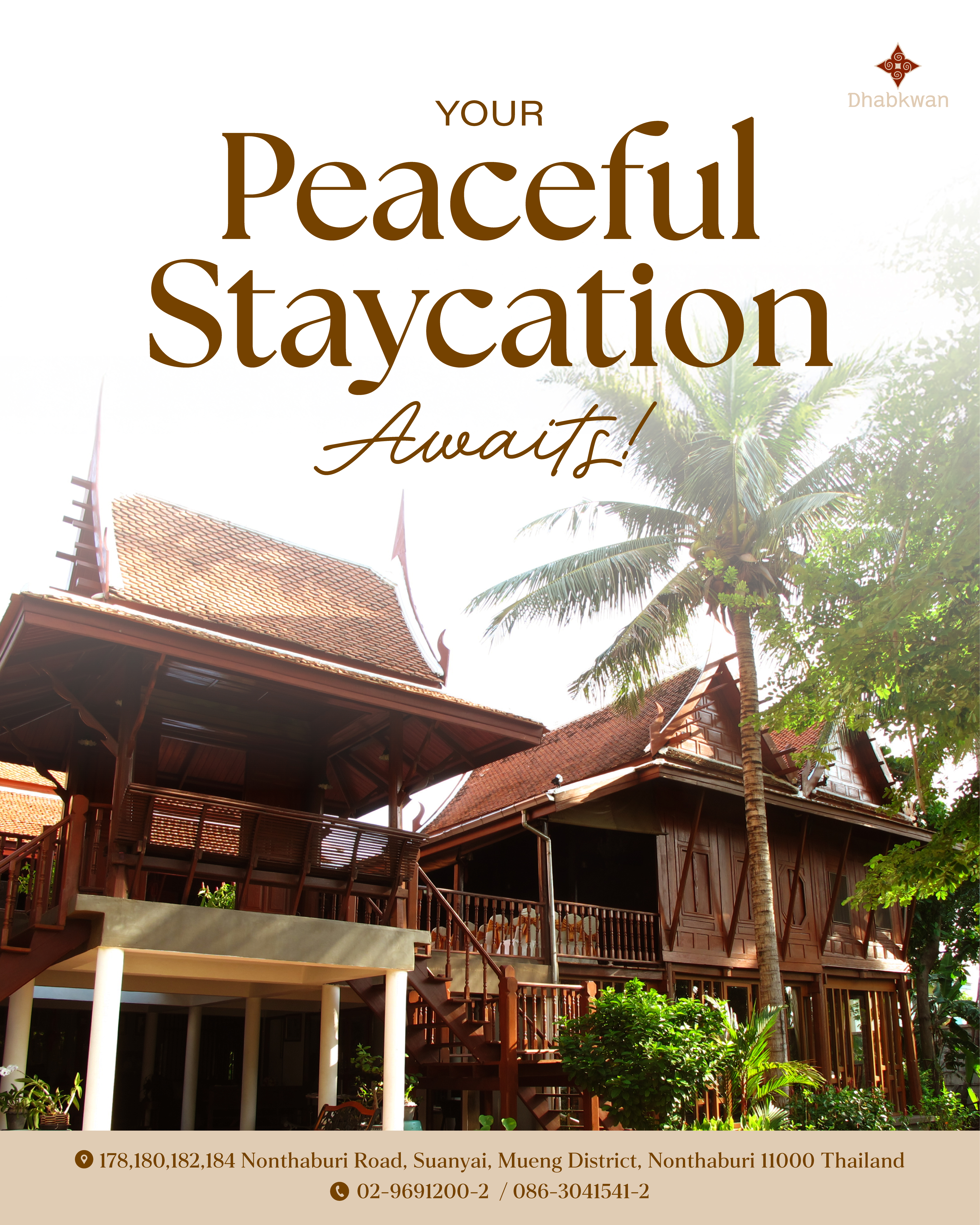 เพียงก้าวข้ามความอึกทึกเข้าสู่โหมดบรรยากาศความเป็นไทย รายล้อมด้วยอาณาจักรบ้านเรือนไทยหลังงามท่ามกลางสวนแมกไม้เขียวขจี สัมผัสธรรมชาติอันอ่อนโยน ดื่มด่ำความสงบร่มรื่น ตื่นเช้ากับวิวบัวชมพูบานรับแสงแดดอ่อนยามเช้า พร้อมอิ่มเอมกับสำรับอาหารคาวหวานพร้อมมูลที่อบอวลด้วยเสน่ห์ไทยๆ มี 3 แพ็กเกจสุดว้าว!!! ให้เลือกสรร ทั้งวันธรรมดา และวันหยุดสุดสัปดาห์ 🏡พักวันธรรมดา: ✨1,999 บาท/คืน (พร้อมอาหารเช้า) 🏡พักวันหยุด/วันนักขัตฤกษ์: ✨2,499 บาท/คืน (พร้อมอาหารเช้า+ชุดน้ำชาและสำรับเครื่องว่างสไตล์ไทย) ✨3,499 บาท/คืน (พร้อมอาหารเช้า+อาหารเย็น+สวมใส่ชุดไทยถ่ายรูปฟรี) Escape the city's noise and find your inner calm at Dhabkwan. Our staycation is designed for those who seek calm without the fuss. The guests can enjoy a comfortable stay in our traditional Thai-style home, wake up to a delicious breakfast with serene lotus pond view and savor the lovely moments in our lush gardens. We have a package for Weekdays and Weekend 🏡Weekday Package: 🌟1999THB/Night (Breakfast included) 🏡Weekend Package: 🌟2499THB/Night (Breakfast and Thai Tea Set included) 🌟 3499THB (Breakfast, Dinner and Thai Attire Experience included) Each package includes a stay in one of our charming rooms. Which Dhabkwan staycation package will you choose? ✍️Book your stay through our website:https://www.dhabkwan.com/